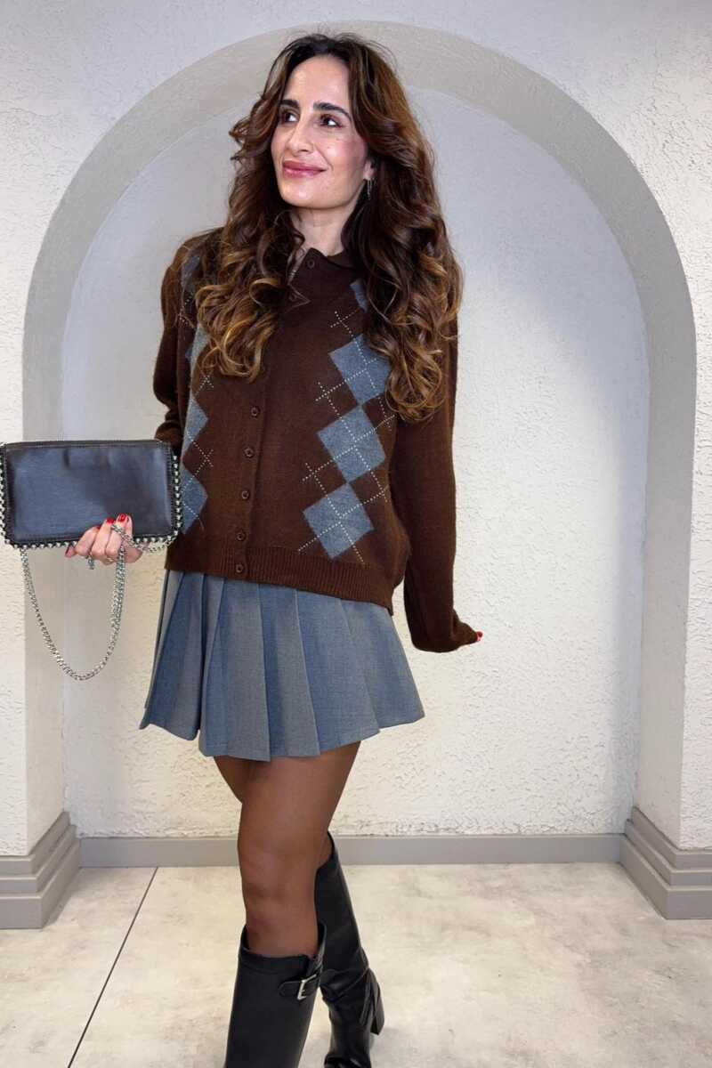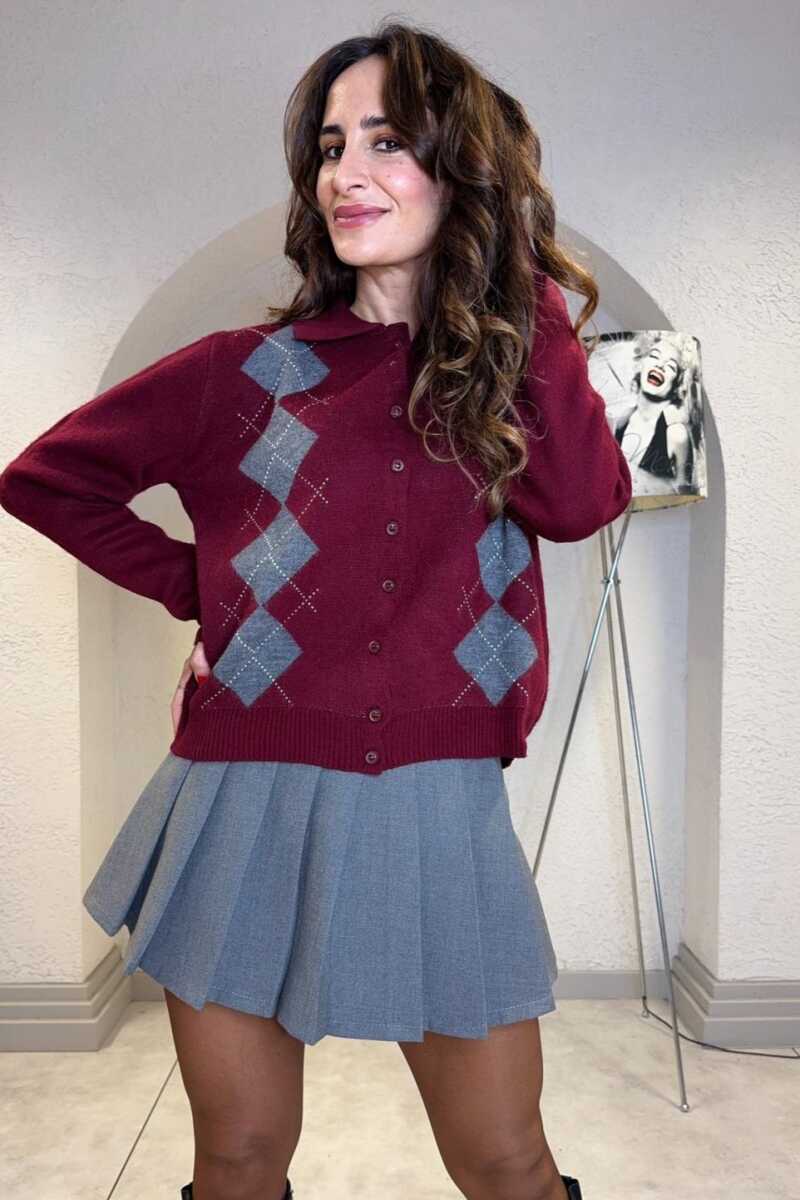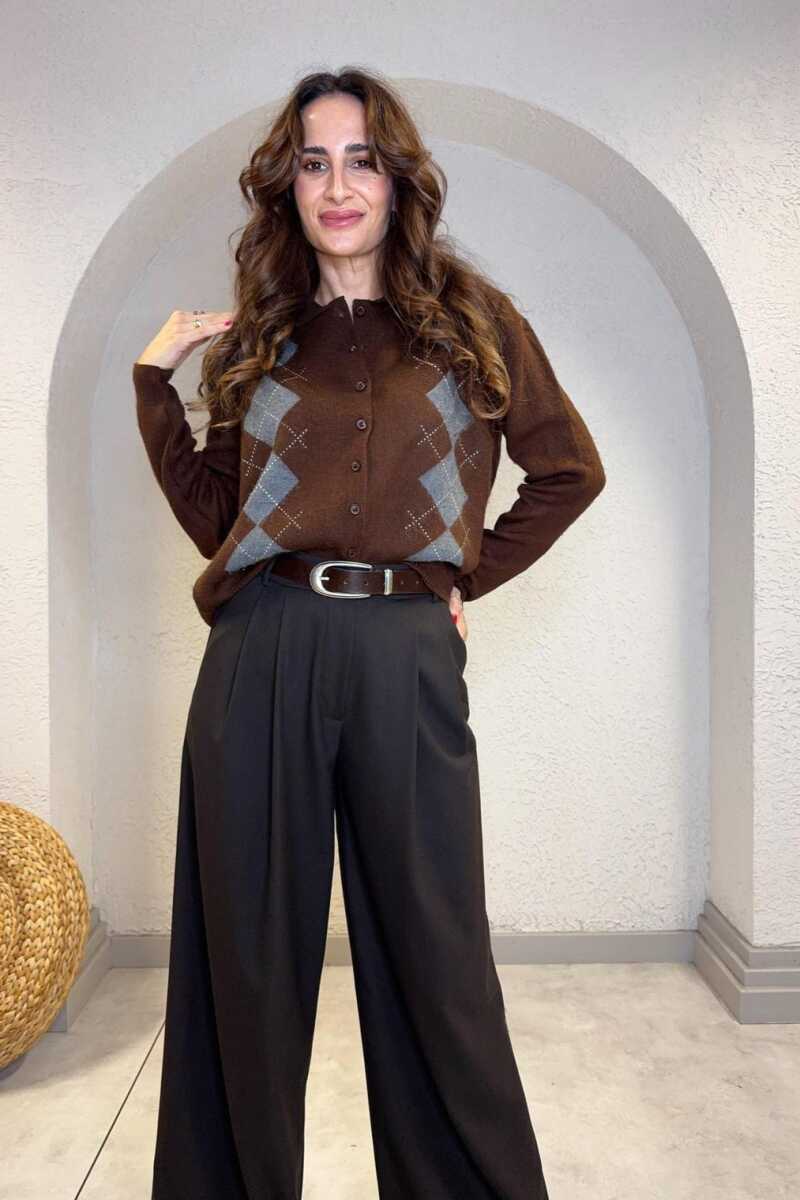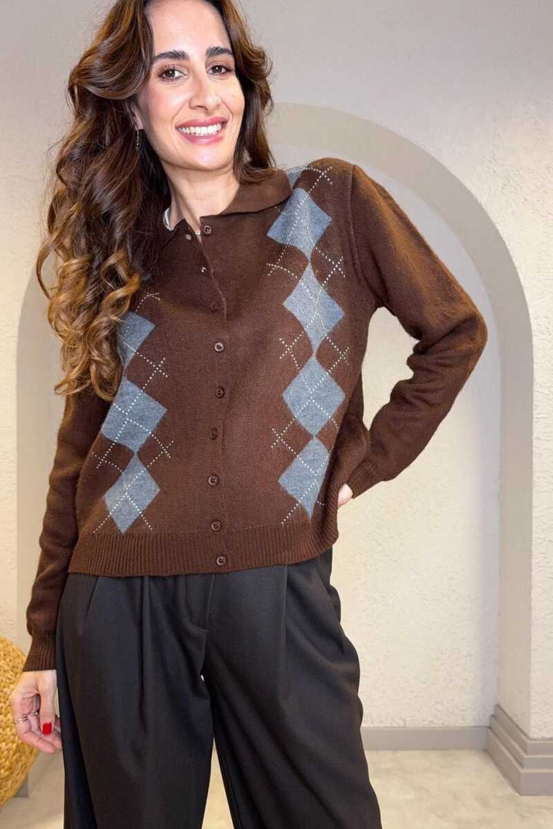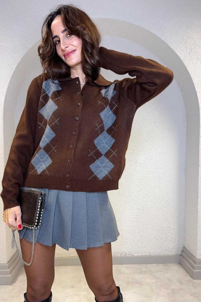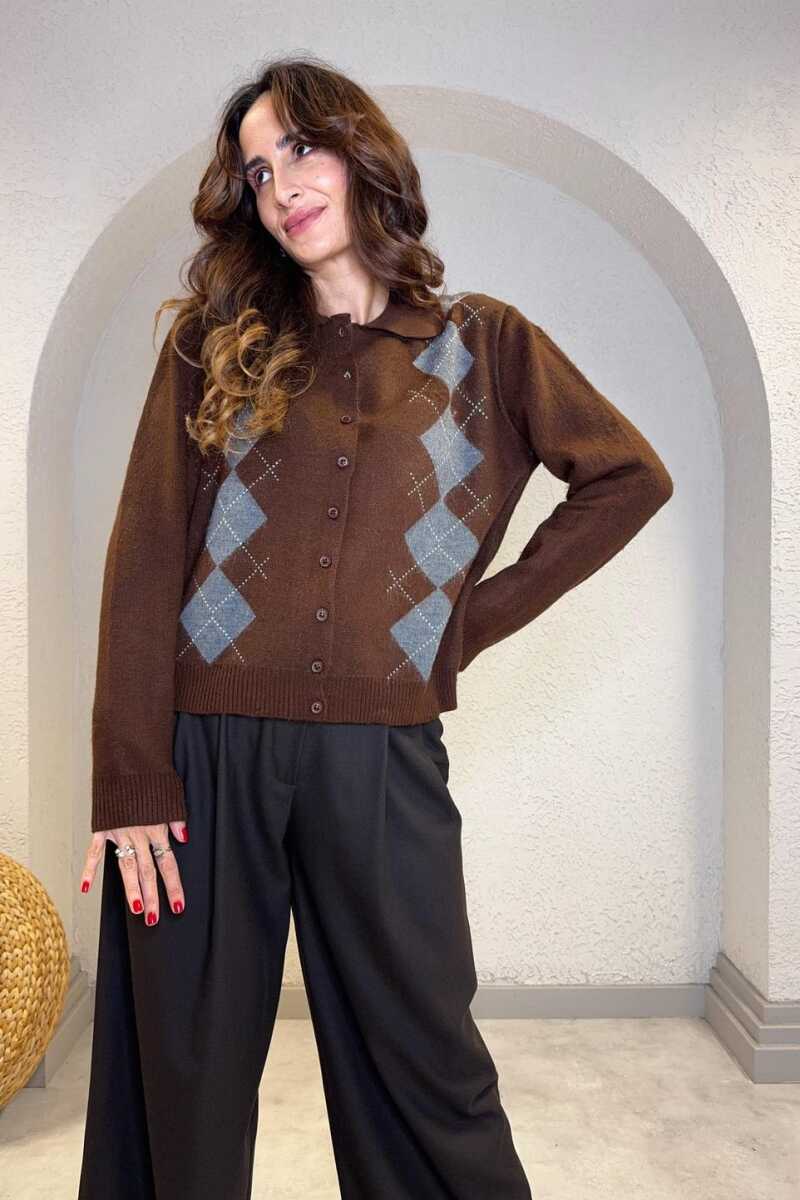 Triko kumaştan üretilmiş, önü düğmeli hırka. Baklava desenlidir. Uzun kollu, düz kesim ve polo yakadır. Rahat kalıplıdır. Yumuşak dokulu, kalın triko kumaşı ile sıcak tutar.