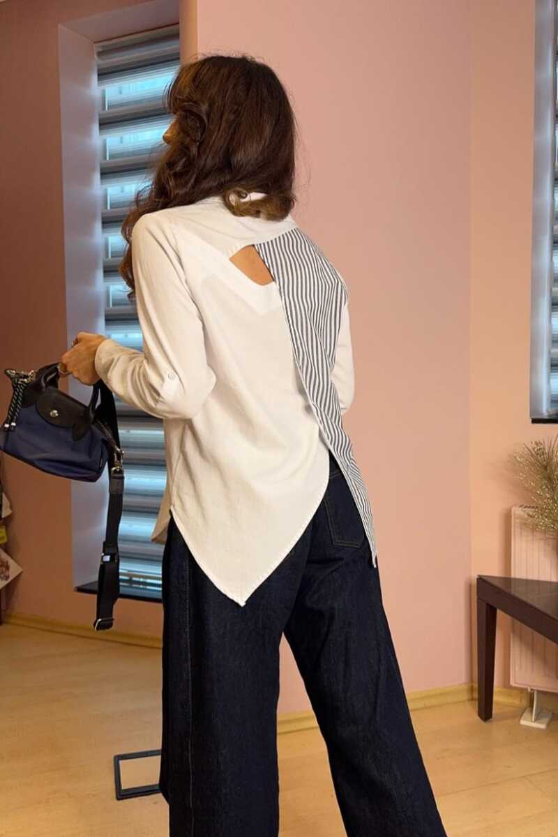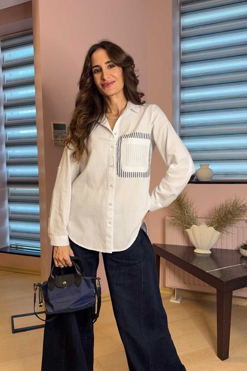 Gelince Haber VerUzun kollu, yakalı ve önden düğme kapamalı çizgili poplin detaylı gömlek.