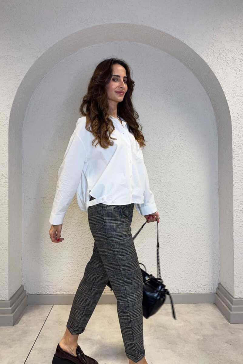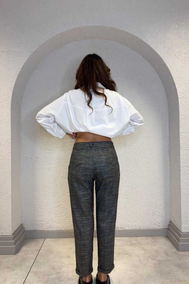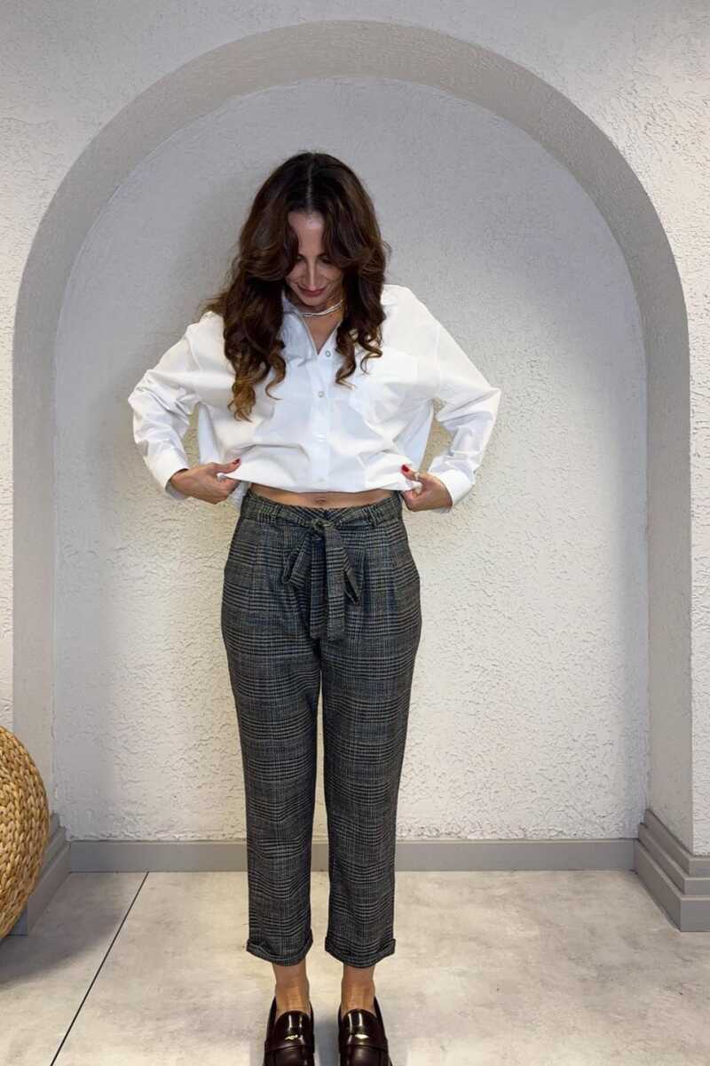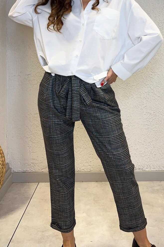 Bağcıklı, yanlardan cepli ekose desenli havuç pantolon. Önü gizli fermuarlıdır. Ön pilelidir. Paçası duble kesimlidir. Yumuşak dokulu dökümlü kumaştan üretilmiştir.