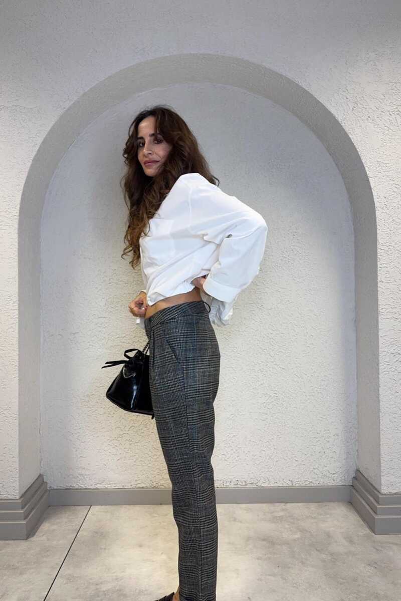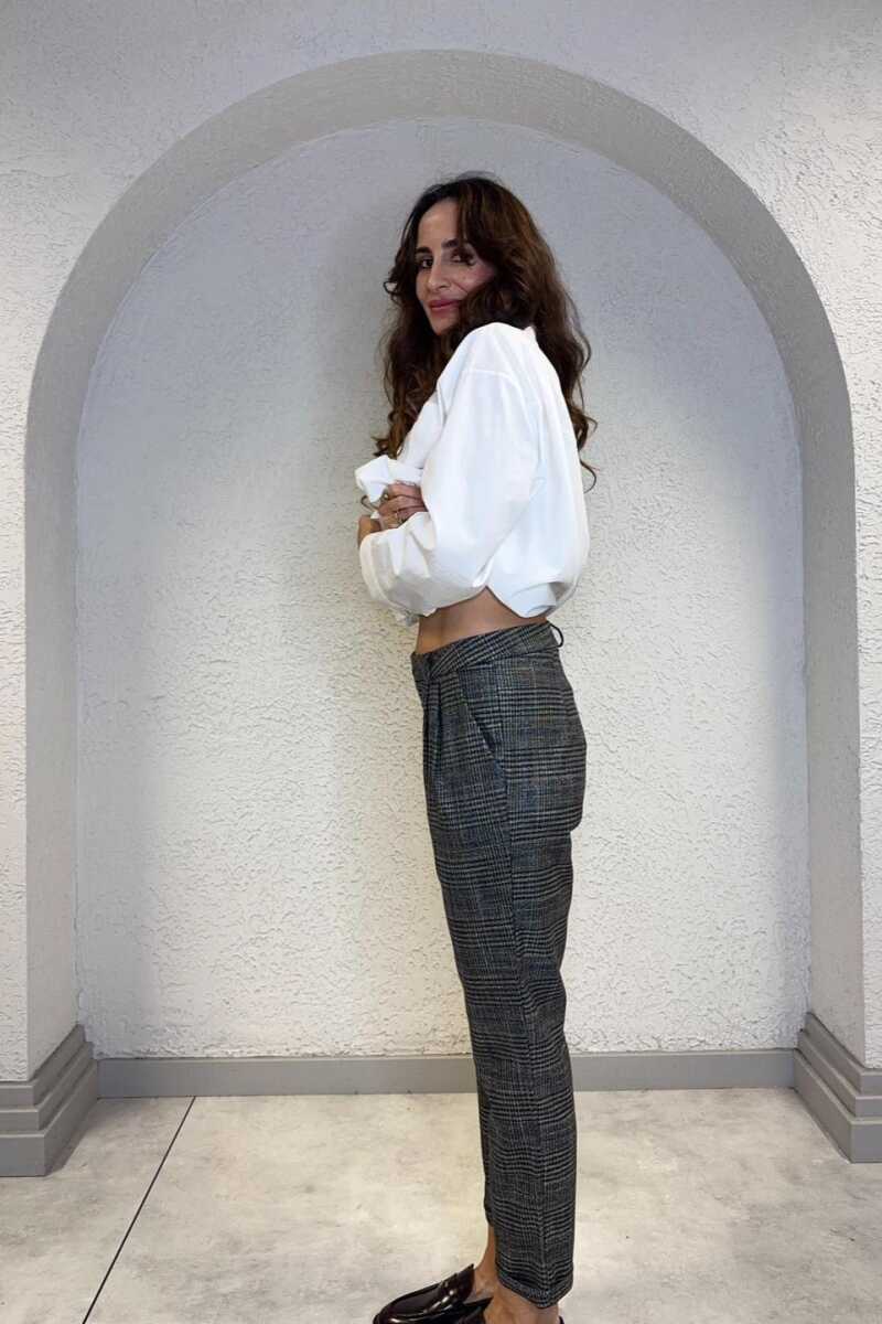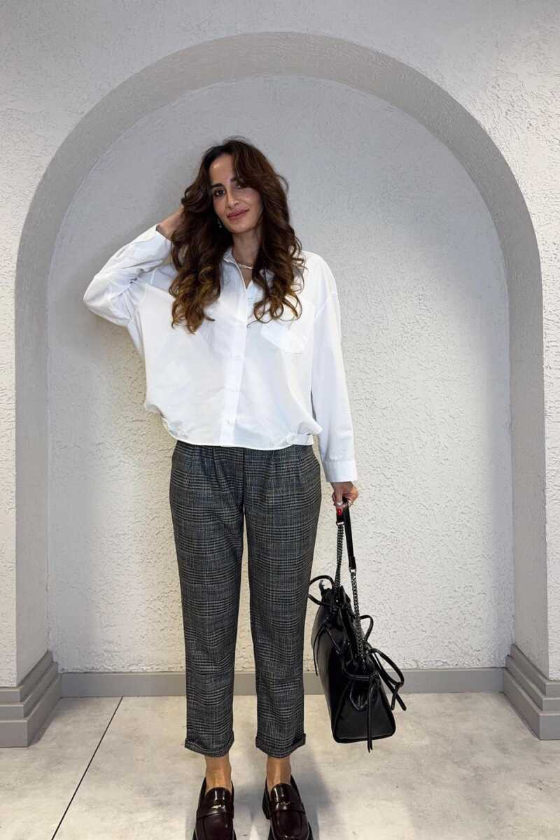 Bağcıklı, yanlardan cepli ekose desenli havuç pantolon. Önü gizli fermuarlıdır. Ön pilelidir. Paçası duble kesimlidir. Yumuşak dokulu dökümlü kumaştan üretilmiştir.
