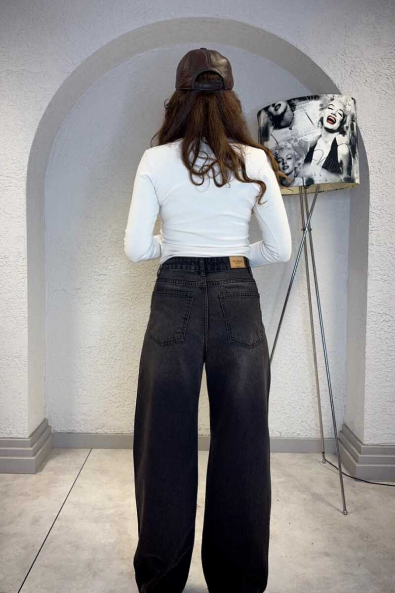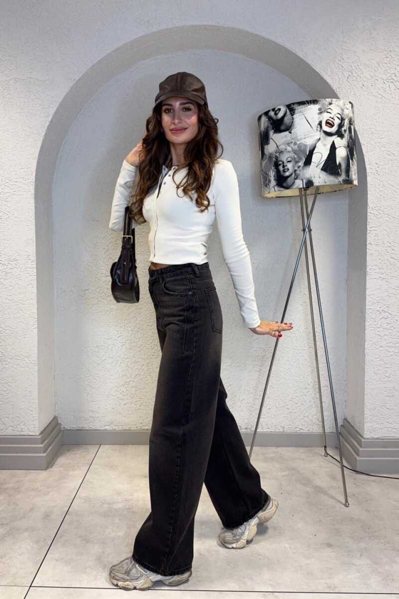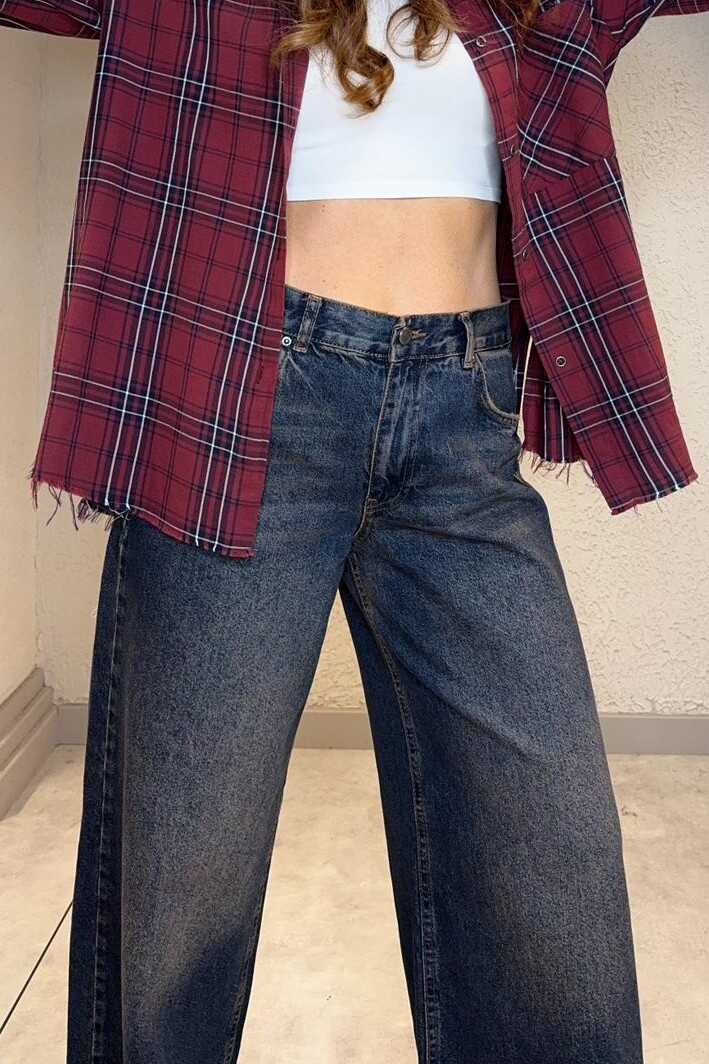 Beş cepli, geniş paça tasarımlı, yüksek bel jean. Önü fermuarlı ve düğmelidir. Rahat kesimlidir. Dökümlü, yumuşak dokulu %100 pamuk kot kumaşından üretilmiştir.