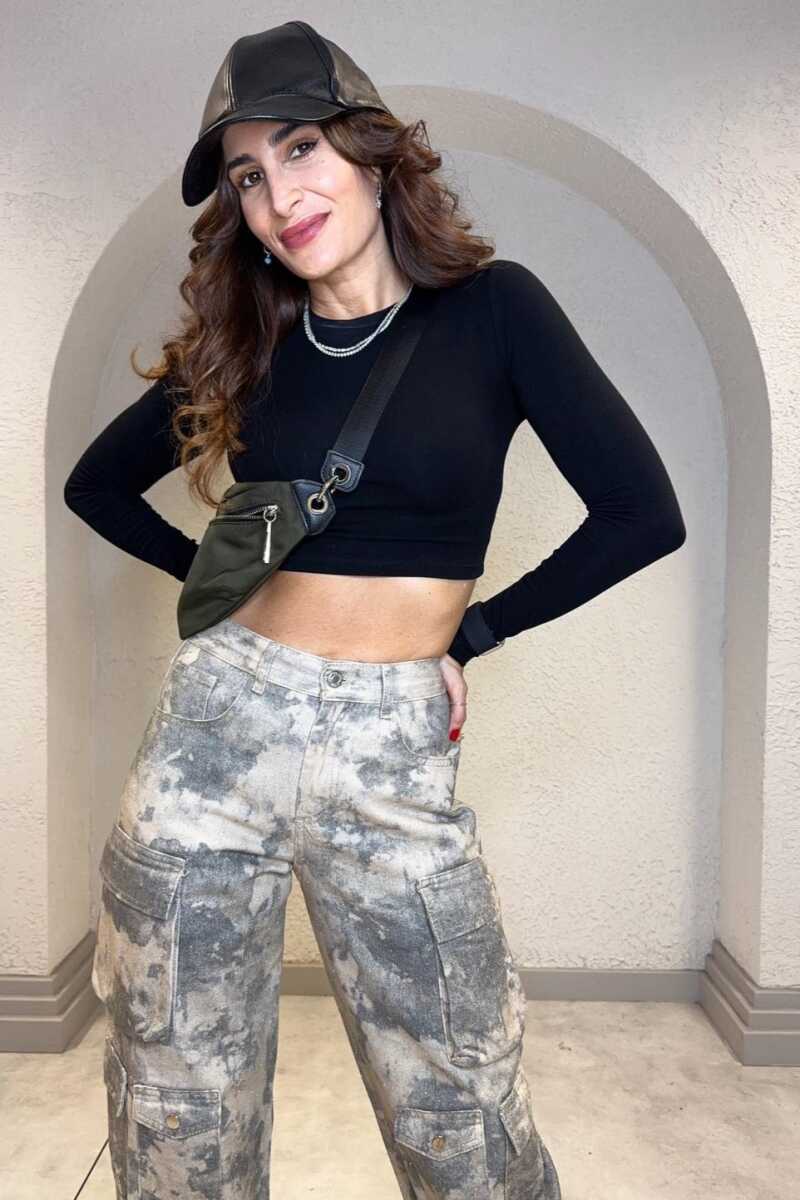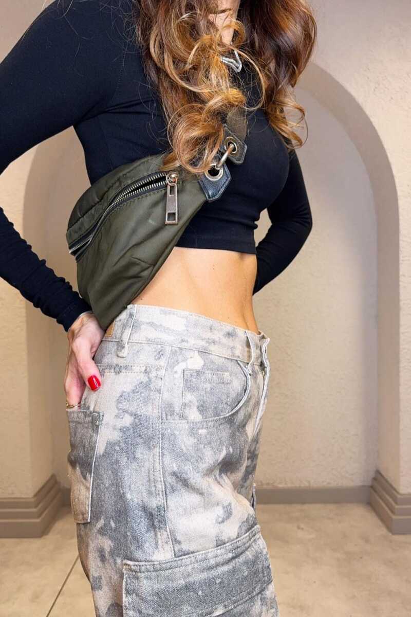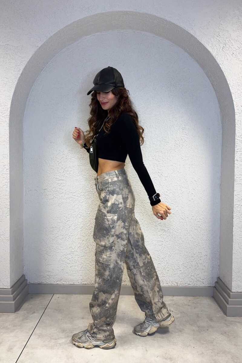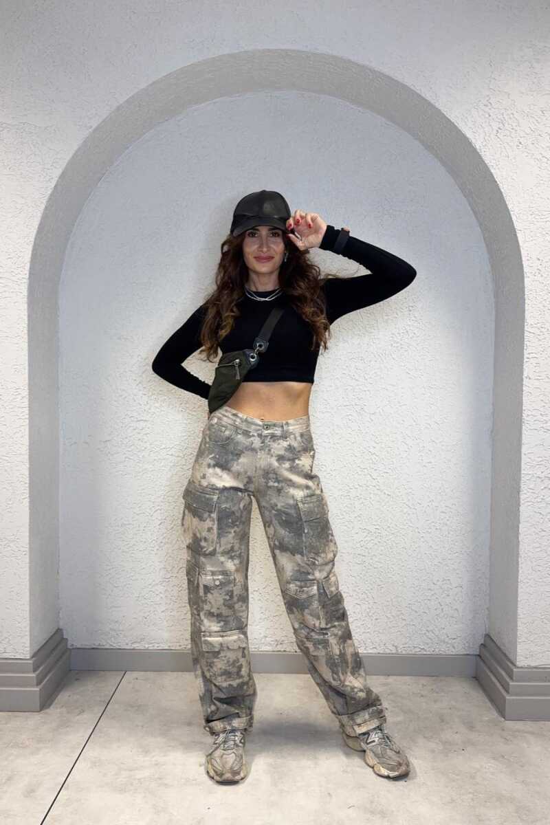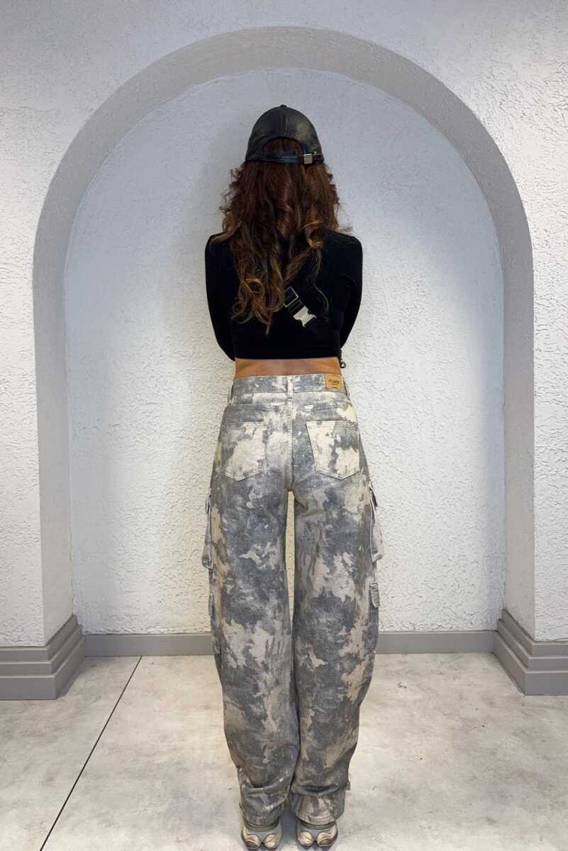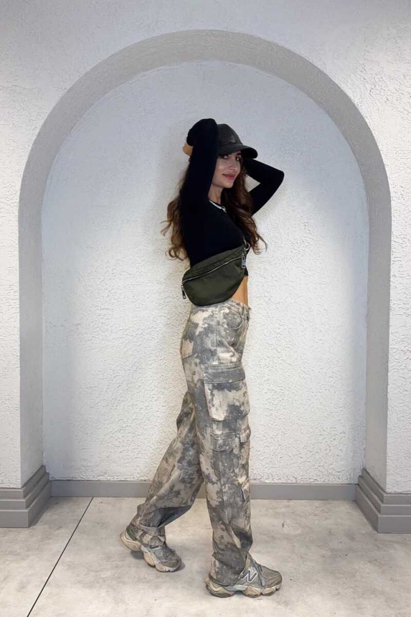 Yanlarda kapaklı kargo cepleri ve paça ucunda apolet detayı bulunmaktadır.